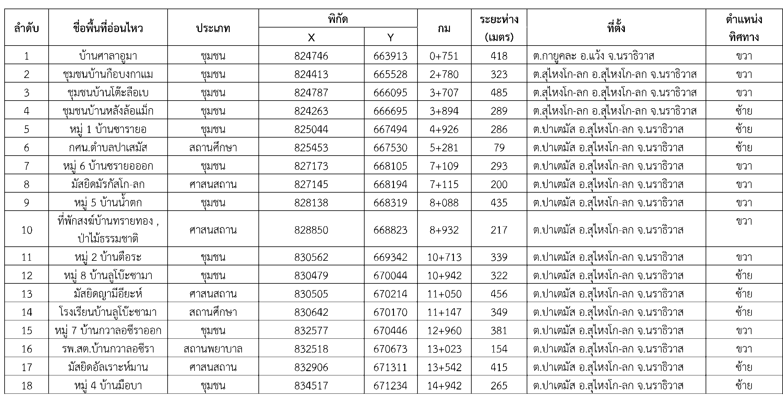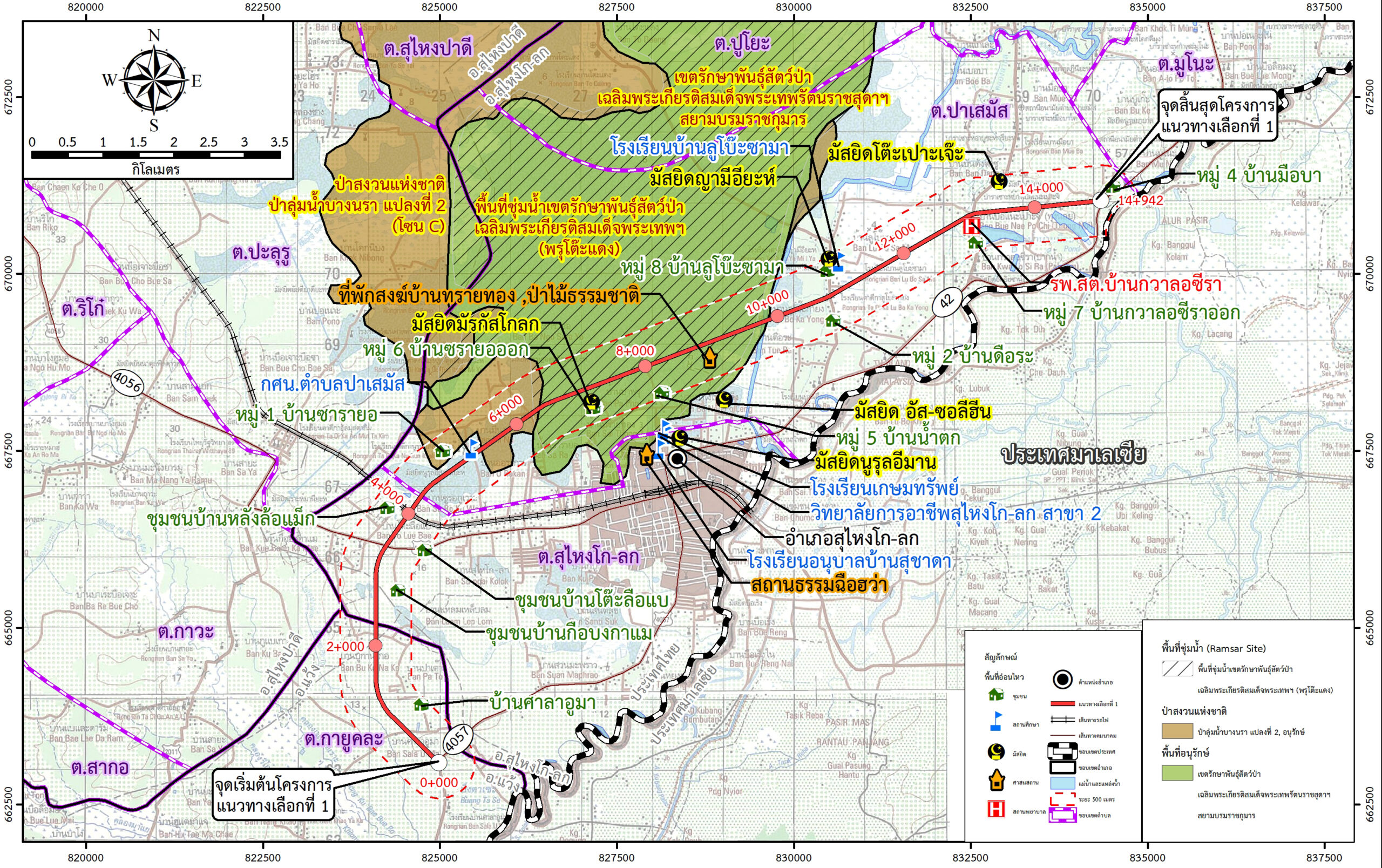 โครงการสำรวจและออกแบบทางหลวง 4 ช่องจราจร ทางเลี่ยงเมืองสุไหงโก-ลก เป็นทางหลวงแนวใหม่ขนาด 4 ช่องจราจร มีจุดเริ่มต้นโครงการบริเวณทางหลวงหมายเลข 4056 (กม.246+000) และสิ้นบรรจบทางหลวงหมายเลข 42 (กม.255+000) ระยะทางประมาณ 16 กิโลเมตร ครอบคลุม 3 ตำบล 2 อำเภอ ได้แก่ ตำบลสุไหงโก-ลก ตำบลปาเสมัส อำเภอสุไหงโก-ลก และตำบลกายูคละ อำเภอแว้ง จังหวัดนราธิวาส ซึ่งมีพื้นที่อ่อนไหวบริเวณพื้นที่ศึกษาโครงการดังนี้